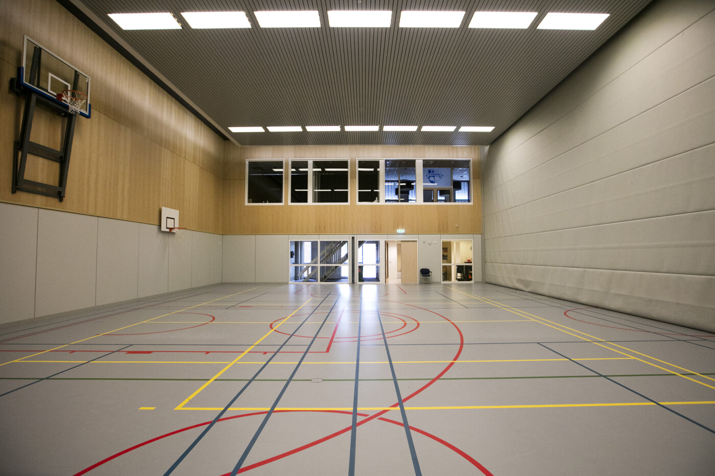 Sportzaal, kleedruimtes, douches, toiletten, kantine.